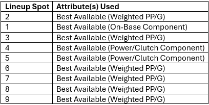 Order Shift: The leadoff spot now gets filled before the 3rd spot, prioritizing the two highest plate-appearance slots with the best fits.