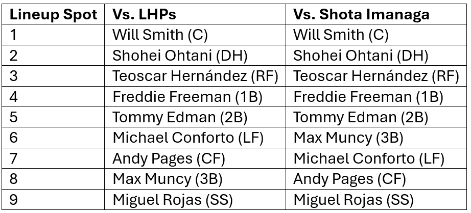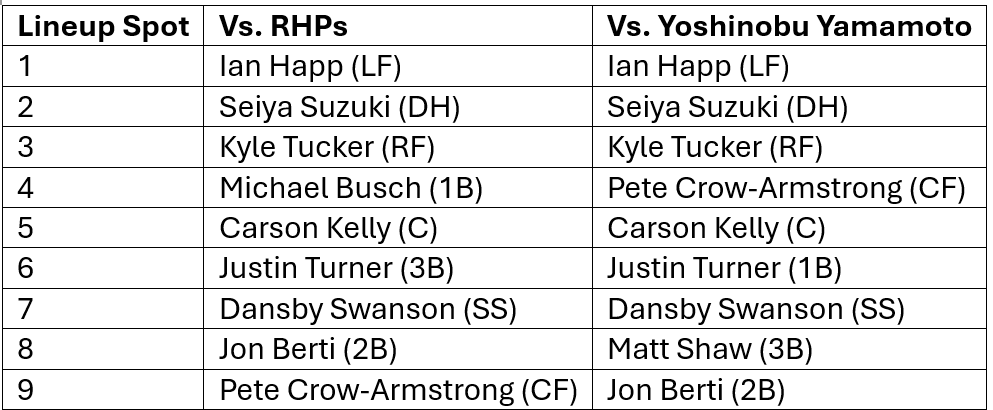 For the Cubs and Dodgers, I’ve generated two lineups each: a general one against RHPs or LHPs, and a matchup-specific one for their Game 1 starters—RHP Yoshinobu Yamamoto for the Dodgers, LHP Shota Imanaga for the Cubs. Let’s see the results.