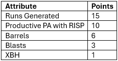 Used to slot the 4th and 5th spots, this component also merges current and three-year performance. I’ve streamlined doubles, triples, and home runs into a single Extra-Base Hits (XBH) attribute and added Statcast’s barrels and blasts to spotlight elite power. Like the on-base metrics, matchup-specific attributes enhance this section when needed.