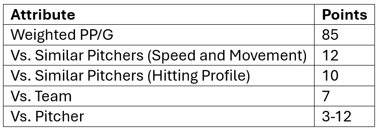 Weighted PP/G forms the foundation for general lineups against each pitcher handedness, providing a sturdy baseline. The final three attributes then step in, fine-tuning the adjustments to deliver matchup-specific precision.