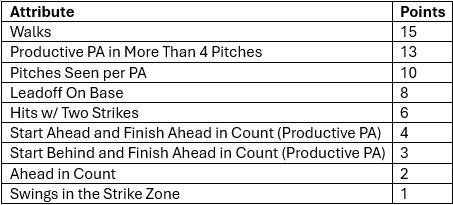 This component, which crowns the leadoff hitter, now blends data from the current season and the past three years into each attribute’s weighted calculation. I’ve swapped out two Version 1.0 attributes (Start Behind/Finish Even and Start Ahead in Count) for four new ones: Pitches Seen per PA, Leadoff On Base, Hits w/ Two Strikes, and Swings in the Strike Zone. These additions better capture a hitter’s discipline and effectiveness. For matchup-specific lineups, these metrics get layered in too.